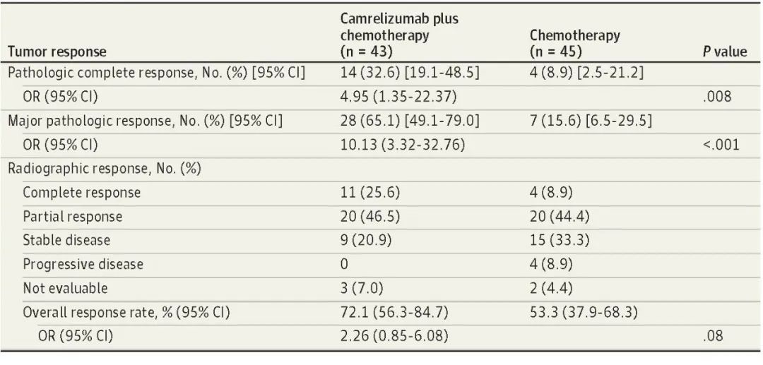 北京时间8月3日,EVO医药创新药卡瑞利珠单抗联合化疗(Cam+CT)对比化疗(CT)新辅助治疗ⅢA/ⅢB (T3N2) 期非小细胞肺癌(NSCLC)结果在线发表于国际权威期刊JAMA Oncology[1]。该研究是由空军军医大学唐都医院姜涛教授、雷杰教授团队联合陕西省肿瘤医院雷光焰教授团队、兰州大学第二附属医院王成教授团队共同参与的一项随机对照、多中心、Ⅱ期临床研究(TD-FOREKNOW,NCT04338620)。研究结果显示,与化疗相比,卡瑞利珠单抗联合化疗新辅助治疗NSCLC显著提高了病理完全缓解(pCR)率(32.6% vs 8.9%,OR=4.95,95% CI :1.35-22.37, P =0 .008),且安全性良好。本研究是卡瑞利珠单抗新辅助治疗可切除NSCLC患者的首个随机对照研究,为NSCLC新辅助免疫治疗再添新证。